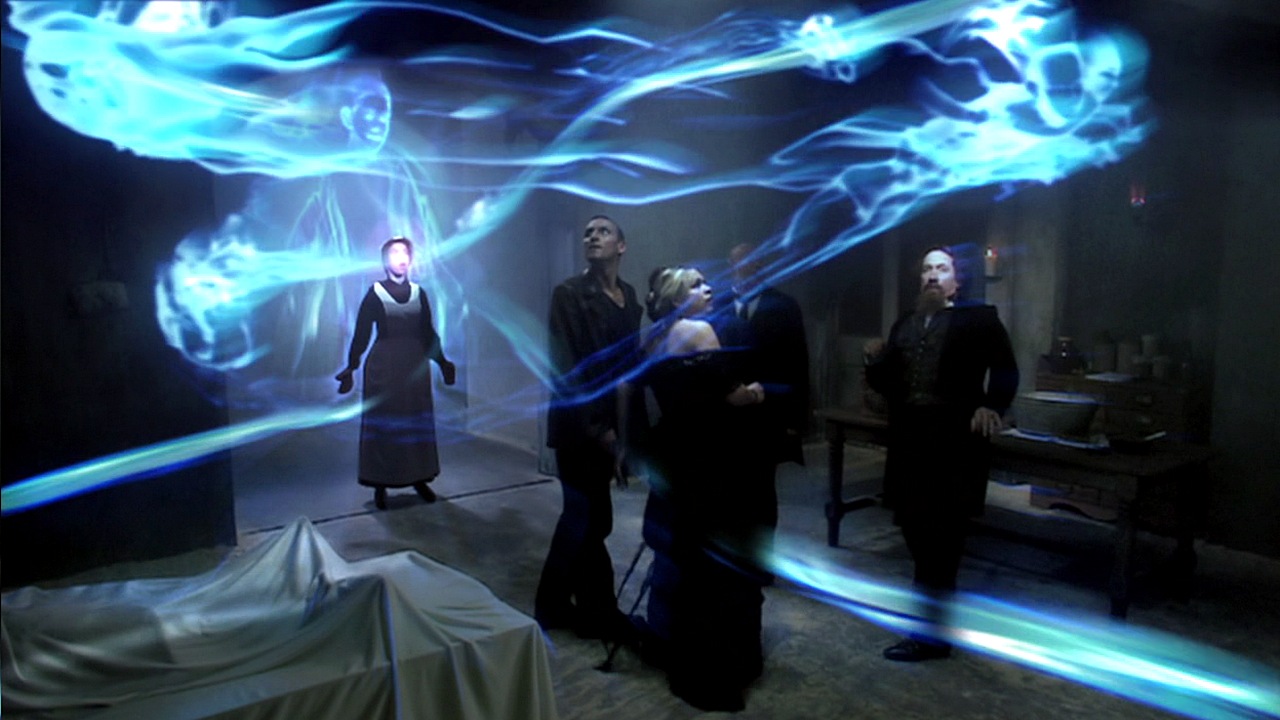 Роза разговаривает с Гвинет и узнаёт, что Снид приютил её у себя дома после смерти её родителей, когда ей было 12 лет. Гвинет видит будущее в разуме Розы - она потрясена тем, что Роза повидала с тех пор, как встретила Доктора. Она объясняет Розе, что у неё всегда был дар ясновидения, и в последнее время способности стали сильнее. Доктор подслушивает разговор - он заявляет, что способности Гвинет связаны с тем, что она выросла в этом доме над пространственно-временным рифтом. Она - ключ к происходящему. Он предлагает провести сеанс связи с призраками.