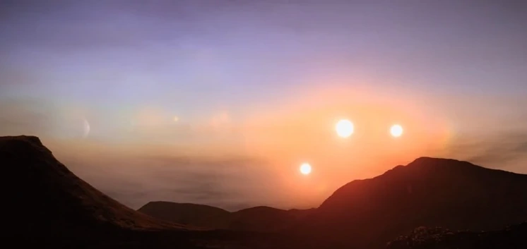 Сложность нахождения этой планеты состоит в том, что она в какой-то момент своей истории сошла с орбиты, и каждый, кто прилетал к этой планете не мог её сразу обнаружить. На этой планете светит три солнца, а ночью - три луны.
