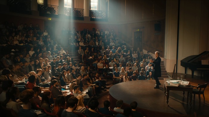 The Twelfth Doctor lectures a room full of students. (TV: The Pilot)