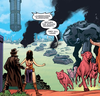 The story starts with Leela, wearing the Fourth Doctor's hat and working over a math problem presented by K9. The Doctor promises to take Leela a banquet on the farmworld Agratis. He also mentions the Jewel of Fawton that has brought tourism to the world. They exit the TARDIS to find the world covered by armoured vehicles and rockets. The Doctor rushes them back to the TARDIS, gets his long scarf caught, and slams the TARDIS door before the Judoon close in on them.