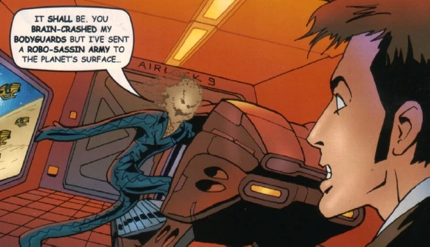 Having armed himself with a battleship, a fleet and an army of robo-assassins, Skalesh is preparing his revenge on the people of Delossa who turned him to dust and imprisoned him alone for ten centuries. The Doctor lands the TARDIS aboard Skalesh's ship and uses his sonic screwdriver to set off a frequency, a resonating chain reaction that shatters the robo-assassins. He mocks Skalesh, telling him that he can not take revenge on his people on Delossa.