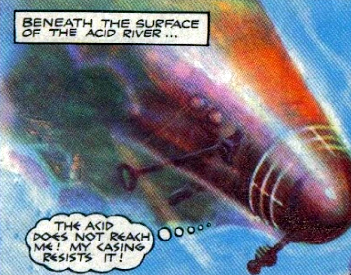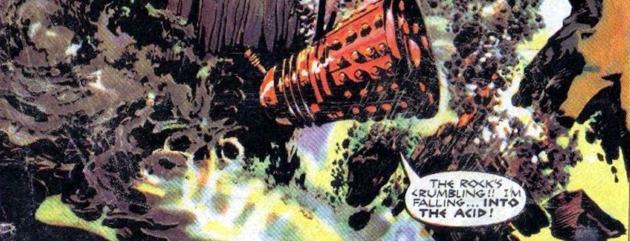 The Dalek Emperor thought that the sulphuric acid would destroy Zeg, so led him onto an overhang above the river. He then shot the overhang, which fell away, and Zeg fell into the river. However, as his casing was made of metalert, the acid could not hurt him, and he emerged unharmed. (COMIC: Duel of the Daleks)