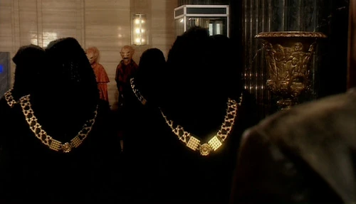 Cassandra also had them knock Rose Tyler unconscious and drag her in a room with its sun filter descending, as revenge for Rose insulting Cassandra. The Adherents of the Repeated Meme were later discovered, and their cloaks collapsed to the floor when the Ninth Doctor used his programming knowledge to make a metal spider go back to its master. One of the Adherents of the Repeated Meme attempted to strike the Doctor and he ripped off its right hand. He then snapped a wire in the hand and the quintet shut down, and their now hollow-looking cloaks suddenly dropped to the floor. (TV: The End of the World [+]Russell T Davies, Doctor Who series 1 (BBC One, 2005).)