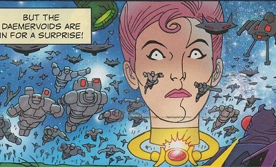 However, the Doctor has a plan. He fits a Tri-D Holomovie disc around the President's neck, sends her back to her seat and tells her to play along and not to resist the probe. The unsuspecting Daemervoids scan the President's brain for knowledge of Earth's defences and are shown that the Earth is defended by an army of four million K-1 Robo-Warriors and a thousand Devil Wing starfighter squadrons!