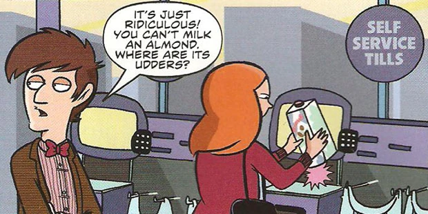 Almond milk was a beverage that Amy Pond asked the Eleventh Doctor to keep a supply of in the TARDIS. She explained that it was healthy for a person's heart, including the Doctor's double hearts, and forced the Doctor to take her to a supermarket to get some when he failed to keep some on supply. The Doctor did not share her favourable opinion of almond milk because he didn't like the name and insisted that almonds could not be milked because they didn't have udders. (COMIC: Unexpected Enemy in the Bagging Area)