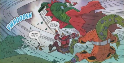 When the Doctor and Decky Flamboon arrive in China in 620, they were not expecting the tornado and rain that they faced. Nor was one of the locals expecting to see a second dragon! The Doctor explains that Decky isn't another dragon — just a talking Brancheerian! The local explains that the dragon flying above them is responsible for the rain and storms, it arrived a few days previous and was greeted with a celebration of fireworks and believed to bring good omens bringing rain to nourish the crops — not floods and winds to bring down buildings. The Doctor on investigating some "scales" scattered on the ground helps him realise that the dragon was actually an Andrassi Warship — a robotic unmanned space vessel sent ahead to batter worlds into submission. The Doctor believes the destructive programming must have kicked in automatically on arriving on Earth. As the robot begins another assault the Doctor uses his sonic screwdriver to super-charge some nearby fireworks turning them into missiles. In a brilliant display of colour, the robot dragon is destroyed. As impressive as it is, Decky still wants to see the Great Wall.