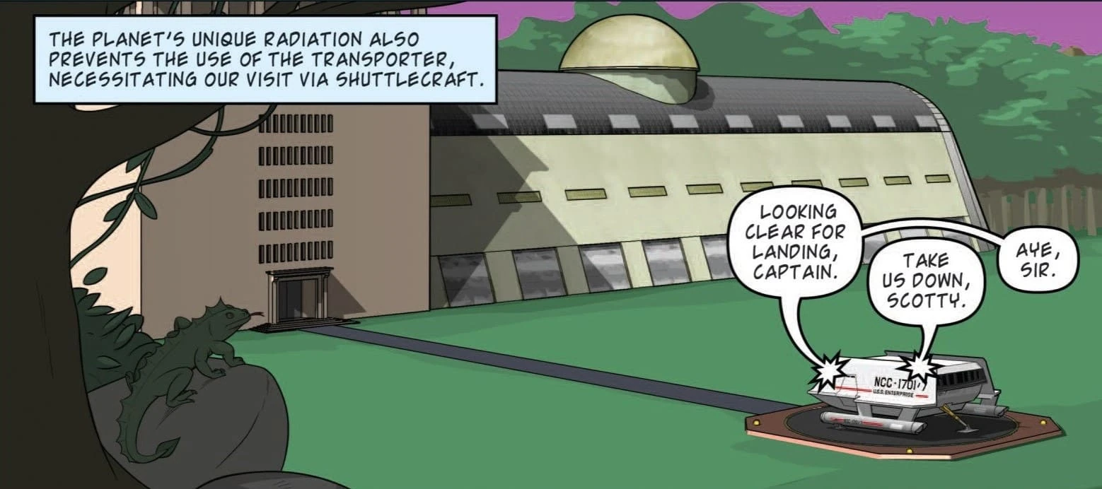 After the archaeologists missed making three scheduled reports, the USS Enterprise was sent to investigate on stardate 3368.5. Captain James T. Kirk, Mister Spock, Doctor Leonard McCoy and Lieutenant Commander Montgomery Scott travelled to the planet's surface in the shuttlecraft Galileo. They met with Professor Whitmore, who blamed the lack of communications on the radiation belt and gave them a short tour of the station.