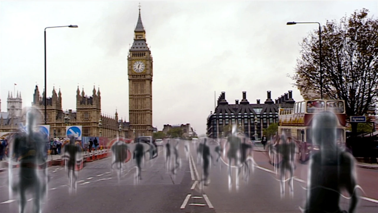 Outside, the Doctor and Rose witness more ghosts, walking among ordinary people, who are going about their daily lives calmly despite the manifestations around them. Jackie says that the ghosts will not be around long — the mid-day "ghost shift" only lasts a couple of minutes. At twelve past, somewhere else in London a white-coated technician pulls back a huge lever and the ghosts fade away. A blonde woman, Yvonne Hartman, steps out of her Torchwood Institute office and states that they measured the "ghost energy" at five thousand gigawatts, and congratulates her staff.