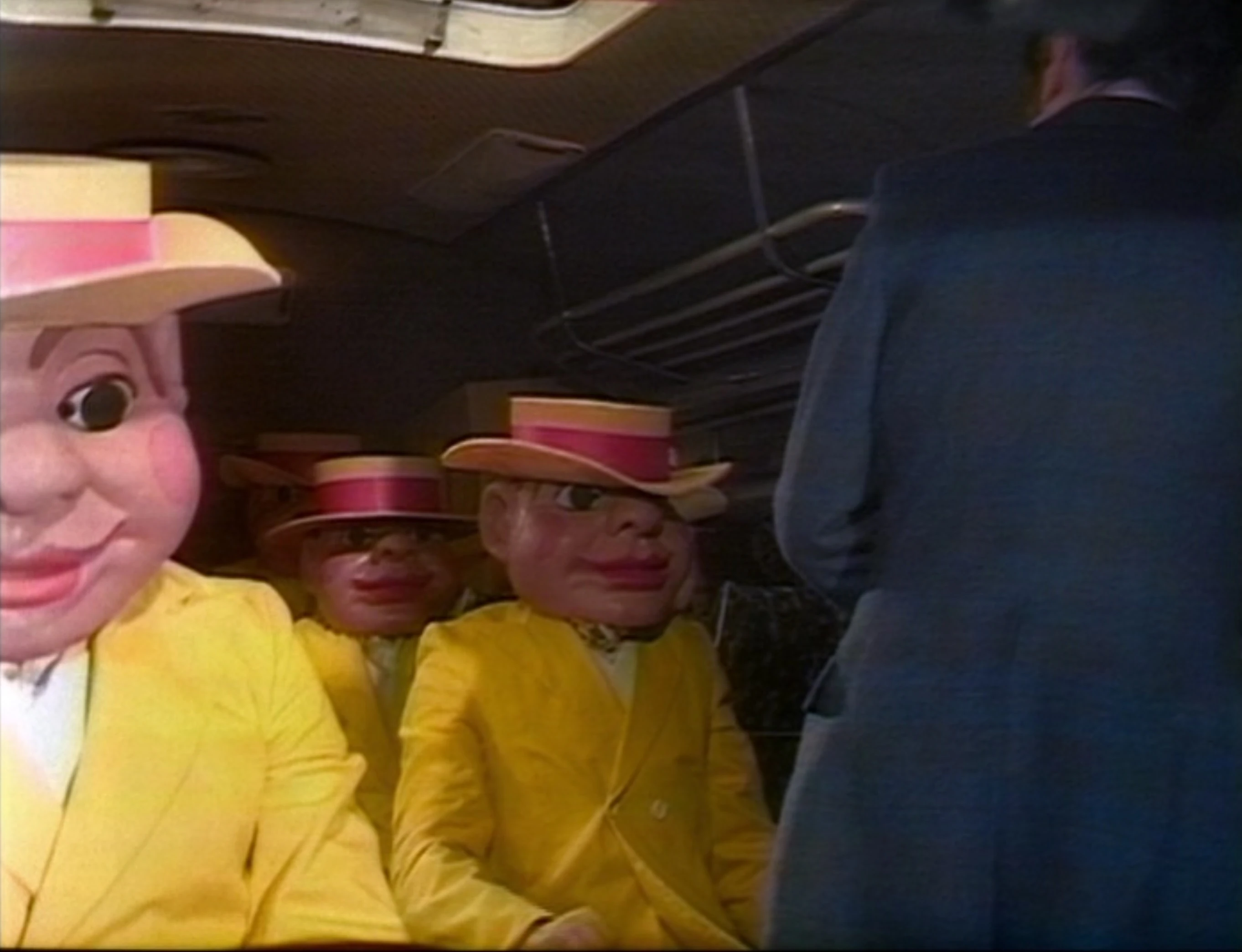 Autons wearing costumes including oversized boaters. (TV: Terror of the Autons)