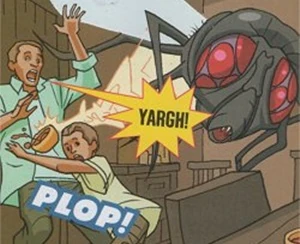 Lunchtime on a sunny day on a farm in Kenya in 2013: the Eleventh Doctor, Amy Pond and Rory Williams arrive just as mealtime is interrupted by a giant fly in Gero and his son Chipo's soup. Rory squashed it with a spade and the three new arrivals show ID as being from "Intergalactic pest control".