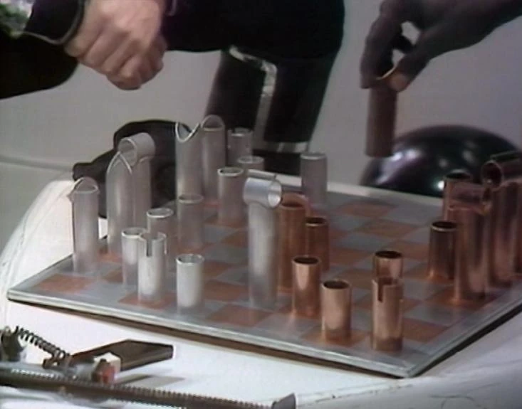 Cotton and Stubbs used pipes with different ends as pieces in a chess game. (TV: The Mutants)