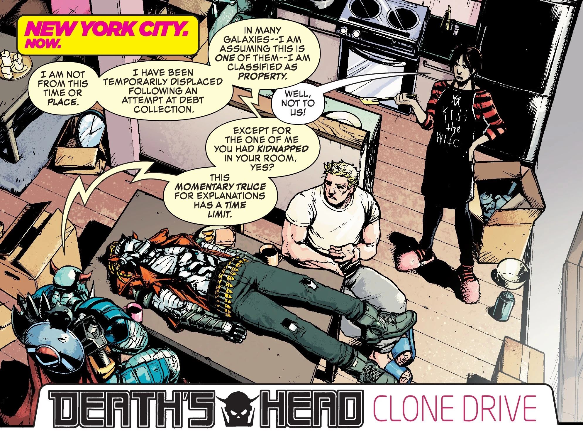 Clone Drive was the name ascribed to the comic story printed throughout Death's Head (2019), from issues 1 - 4, and was cover-dated from September to December 2019. It featured two brief cameo appearances by Keepsake's vulture, first introduced in Doctor Who Magazine's Keepsake, in the forms of a vision seen by Wiccan while looking into "all possible realities", and one of Death's Head's memories, the latter of which reused a panel from The Body in Question. It also reused panels from various prior Death's Head comics in the same context, including one from The Cast Iron Contract, an earlier crossover.