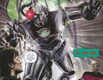 The Borg and Captain Picard of the USS Enterprise-D, with the support of the Doctor, formed an uneasy alliance for mutual benefit and stormed the Cyber-Controller's ship. The Doctor, Picard, Lieutenant Commander Data and the Borg-converted Marcus Bertrand stormed the Cyber-Controller's throne room. The Cyber-Controller was overcome and Bertrand set all of the Cyberships to self-destruct through the cyber-web that linked them together. (COMIC: Assimilation²)