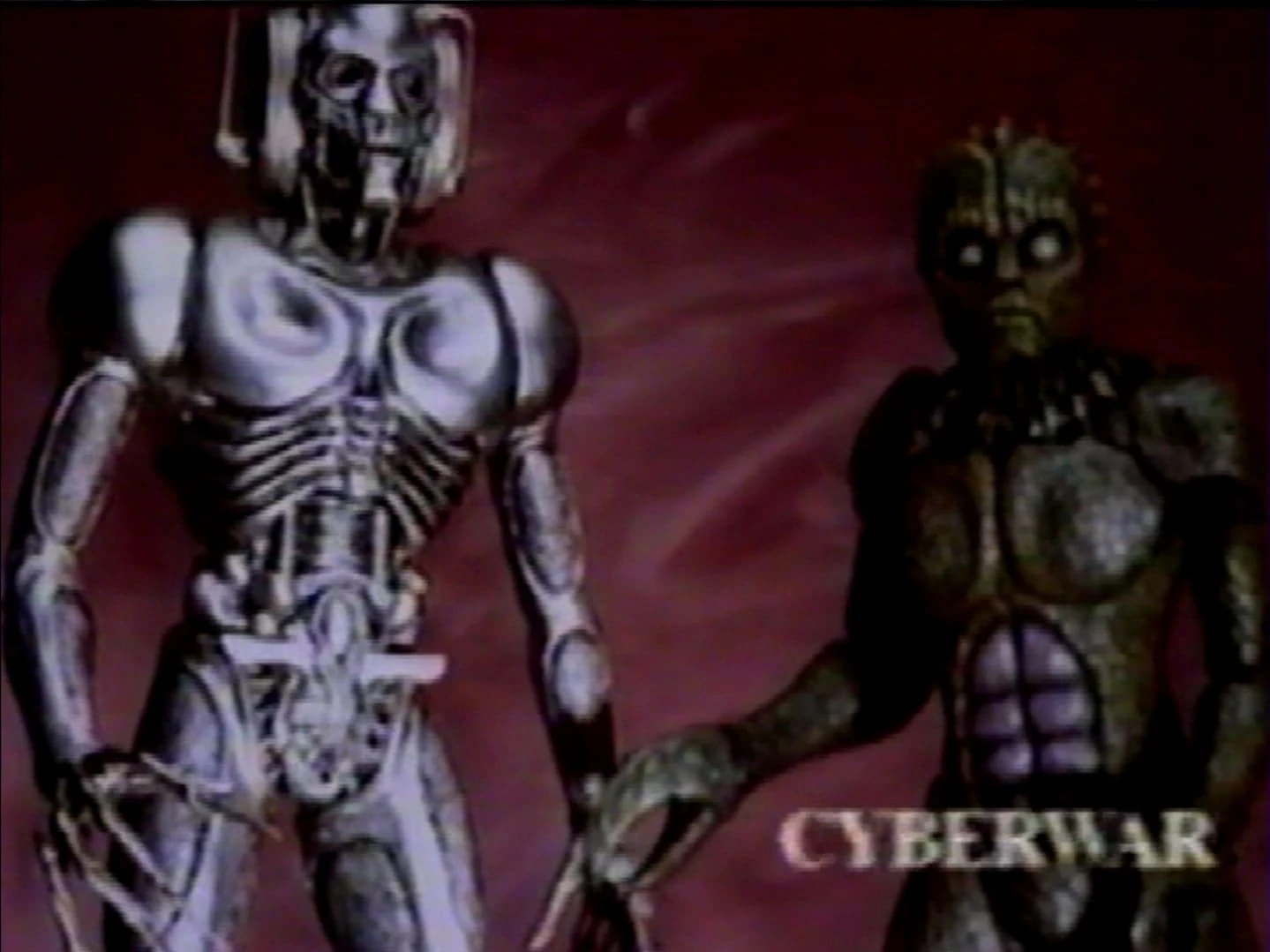 In The Doctors: 30 Years of Time Travel and Beyond, released in 1995, Cyberwar was slated as an "upcoming release", that teamed-up the Cybermen and the Ice Warriors, with designs used to promote the film, created by Chris Fitzgerald, originating from The Dark Dimension.[1] Baggs would later say he didn't remember that the Ice Warriors were ever meant to appear and thought it was just that the documentary had the Fitzgerald marquettes (without permission to show them). In contrast, Briggs remembered that the Ice Warriors were indeed part of a fourth version of the plot, with a scene where a woman on a motorbike removes her helmet to reveal an Ice Warrior helmet underneath.[2]