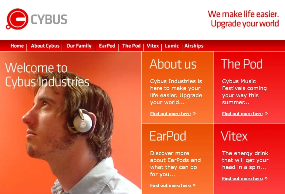 The home page of the Cybus website, with links to various other pages on the site.