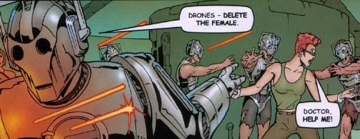 The Doctor and Kadett followed the Cyberman's signal, taking a robot-run airship across the now-deserted continent of Azlon on the planet Centuria. Before arriving at the airbus terminal (a Cyber-conversion factory), the conductor/law enforcer became influenced by the Cybermen's hypnotic signal, which was being used to subjugate the arriving humans. The Doctor, Kadett and a reprogrammed robot conductor pretended to be hypnotised and followed the other arrivals. Seizing the right moment, the Doctor disrupted the hypnotic signal and the conductor robot attacked the Cybermen. A stray shot from the conductor ruptured the fuel banks, causing a huge explosion which killed most of the newly converted Cyber-drones (basic work units) as their humanity started to become more dominant. As the Doctor and Kadett fled the explosion, they found a bit of a map in a Cyberman's hand. (COMIC: Drones of Doom)