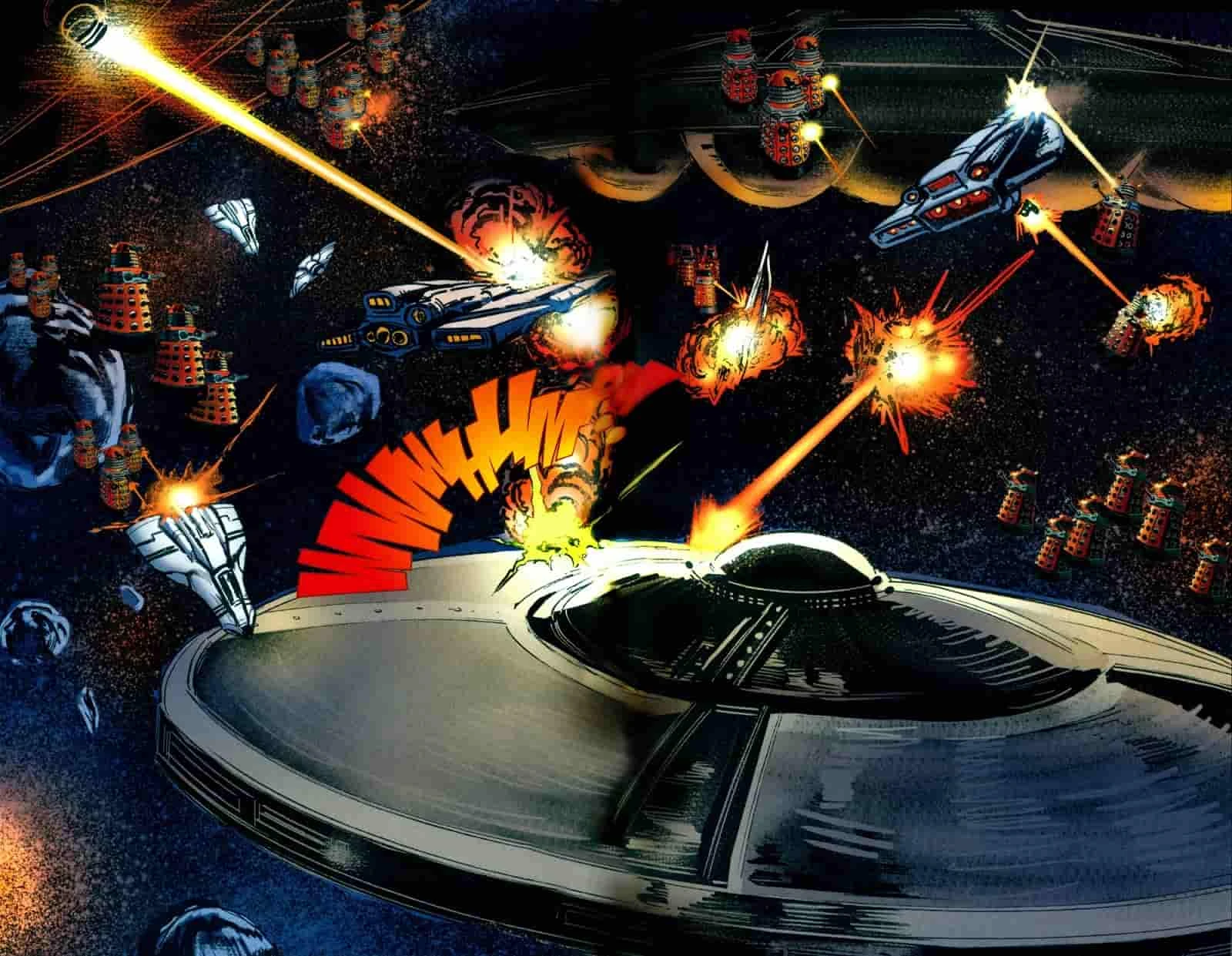 Dalek saucers fight in a war against the Space Security Service. (COMIC: The Only Good Dalek)