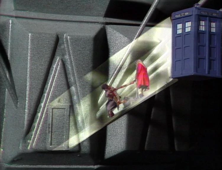 The Fourth Doctor, Romana and K9 pass through the defence shield of the Doctor's TARDIS. (TV: The Horns of Nimon)