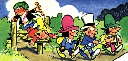 The Diddymen once took a hike, potentially taking part in several activities along the way. First, they may have gone hunting with Basil Brush. Next, they may have helped Dad to chase Mighty Moth. After this, they may have stopped to listen to Dr. Who playing his recorder. Later, they may have lent Stanley a handkerchief. Later still, they may have stopped for jam butties. Yet later, they may have stopped to help Brutus up, out of a hole. After this, they may have been arrested by the Keystone Kops. They may also have helped "TV Terrors" escape Hoppit. Finally, they returned home to Knotty Ash. (GAME: TV Comic's Counter Game [+]TV Comic games (Polystyle Publications, Ltd., 1968).)