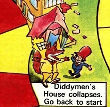 The Diddymen's house collapses in front of Basil Brush. (GAME: Basil Brush goes Rent Collecting [+]TV Comic games (Polystyle Publications, Ltd., 1969).)