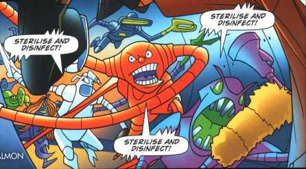 When a space plague threatened the station, the Disinfectroids quarantined it and began cleaning it up, going so far as to clean up the people on board and deposit them on the garbage planet as well. The Tenth Doctor and Rose Tyler arrived at the station in the TARDIS and encountered the robots while investigating the disappearance of the people. The Disinfectodroids pursued the Doctor and Rose back to the TARDIS, depositing it and them on the garbage planet. The robots were planning to leave the station and clean up Earth itself when the Doctor returned with the people and the natives, who attacked and destroyed many of the robots with their spears. The rest were reprogrammed to clean up the garbage planet and send the garbage to Acme Industries headquarters in the hope that it would change their corporate policy. (COMIC: The Germ War)