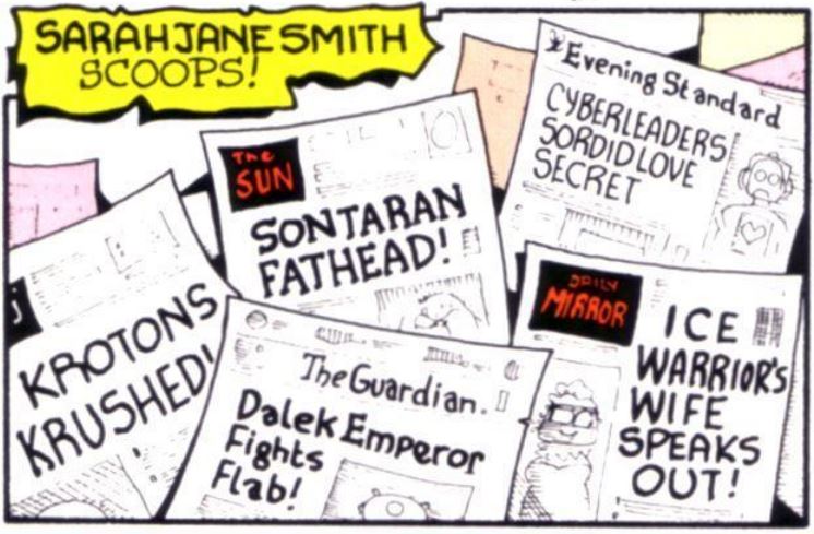 - One newspaper prints the headline "Krotons Krushed", The Sun prints "Sontaran Fathead", The Guardian prints "Dalek Emperor Fights Flab", the Daily Mirror prints "Ice Warrior's Wife Speaks Out!", the Evening Standard prints "Cyberleader's Sordid Love Secret", and the Star goes with "Gallifreyan Scoutmaster Tells All!".