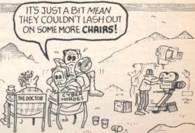 - The Cybermen tell the Doctor they don't mind having to double or treble up or having to dash around like greased chickens to make it seem like there are hordes of them, but they do complain about having to share a single chair.