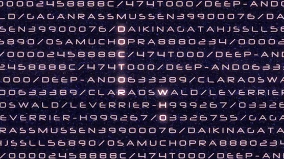 During the broadcast version of the Series 9 episode Sleep No More, a special logo was used to reflect the found footage style of the story (as well as resembling the code text seen in the openings of the Matrix films). The letters DOCTOR and WHO are highlighted shown vertically among what appears to be horizontally-aligned text similar to computer code, appearing alongside numerals and various character names from the story, including "GAGANRASSMUSSEN", "OSAMUCHOPRA", "DEEP-ANDO", "LEVERRIER", and "CLARAOSWALD", shortly after Gagan Rassmussen's beginning video message.