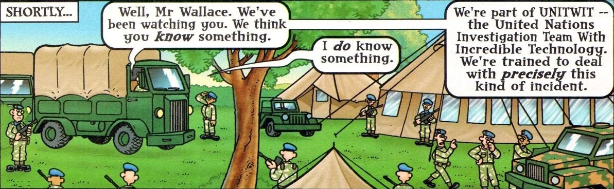 In the Wallace and Gromit comic "The W Files" there is a spoof of the Brigadier, Sergeant Benton and UNIT.