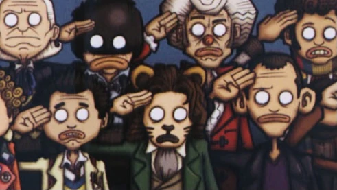 All eleven incarnations of the Doctor stand in a row and give a salute.