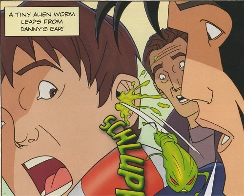 The sonic device causes a tiny alien worm (a Harmonelid) to burst from Danny's ear in a rush of green slime. It falls to the floor, where its growth is accelerated and it escapes by hurling itself through a glass window. Waiting outside the window with a small fishing net, Rory Williams fails to catch the worm. It zooms off and conceals itself in a busy hospital waiting room.