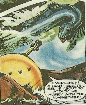 A giant electric eel lived in the watercourse below the Dalek City on Skaro which led to the Lake of Mutations. When the Monstrons attacked, the Dalek Emperor fell into the watercourse and was menaced by the giant eel. The Daleks captured the eel and utilised it for power. (COMIC: The Menace of the Monstrons)