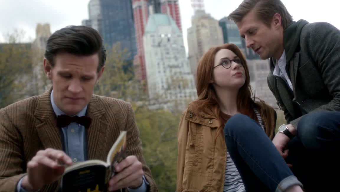 The Doctor reads while the Ponds enjoy Central Park. (TV: The Angels Take Manhattan [+]Steven Moffat, Doctor Who series 7 (BBC One, 2012).)