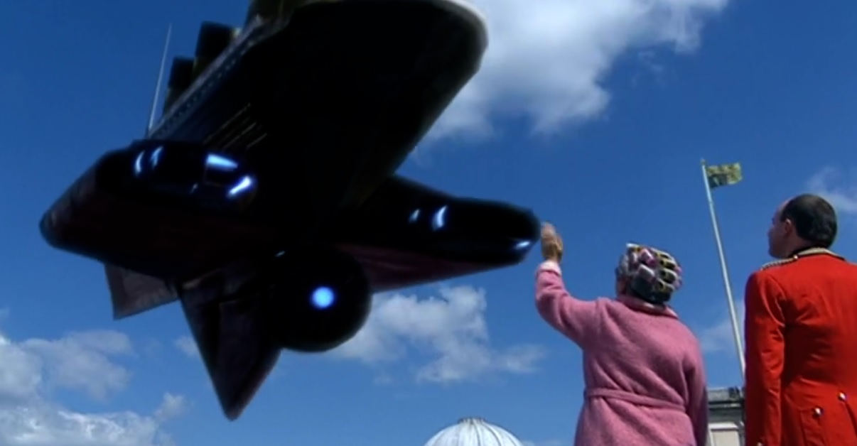 Elizabeth II waves to the Tenth Doctor after he successfully prevented the Titanic falling upon Buckingham Palace. (TV: Voyage of the Damned)
