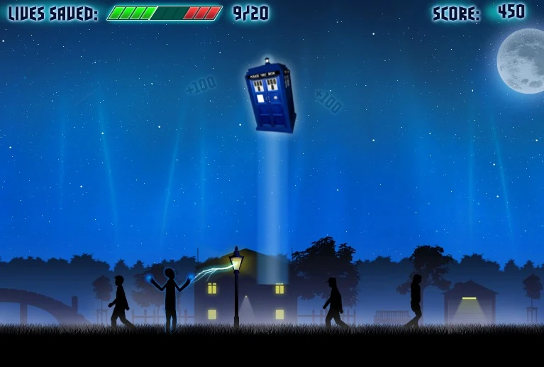 The TARDIS has to be controled by using the arrow keys to go left or right. If you press the space bar the humans will be beamed up. The beams have to be timed to successfully rescue people. If you rescue an Ood you will get bonus points. Oods only appear in the game when a special code from the Doctor Who: Monster Invasion magazine is added. The Silence is recognisable through their electrically charged hands. If you beam up the Silence they will explode and you will loose points.