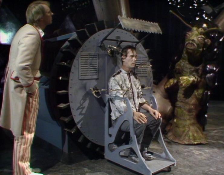 Together with Brazen, the Doctor pulled Plantagenet free. As they turned to flee, Turlough, suffering from the awakening of an ancestral memory, approached the machine.