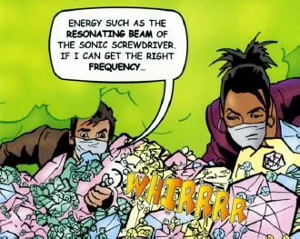 In 3000 Tokyo, the Tenth Doctor and Martha Jones, having escaped duelling bank robbery attempts by gangs of aliens, were trapped inside the vault of one of the gangs. When a poisonous gas was vented, the Doctor and Martha donned masks to prevent themselves from inhaling it. (COMIC: Operation Lock-up)