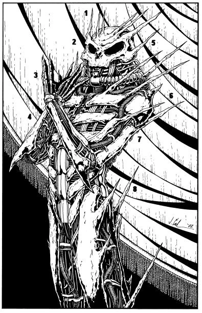 As a result, this suit can best be described as part armour and part carnival construction, and its heavy use of skull-and-spines imagery may be more than a little tongue-in-cheek.