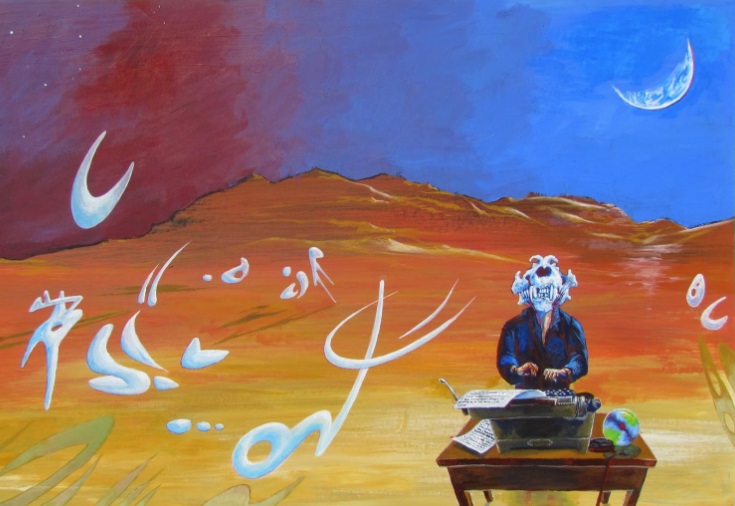 Triphis with a typewriter and the chronomasticon on primitive Earth. (PROSE: Liberating Earth)