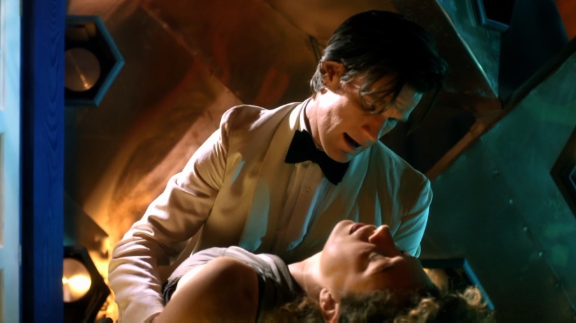 While she is off looking through the dresses, the Doctor lands the TARDIS and hears laser-gunfire outside. He opens the door as a second River enters, calls him a nostalgic idiot for returning to this spot and collapses into his arms.