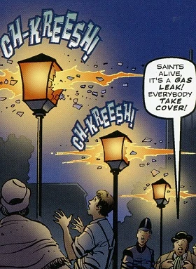 Blackthorne Gasworks provided the gas for many of these lights and Morjanus chose it as the location for her proto-morphic lifeform. After three years, the lifeform was fully integrated into the gas system. It caused the lights to shatter and Pyrodines to be released from them. (COMIC: The Curious Tale of Spring-Heeled Jack)