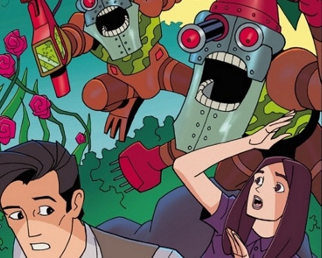 The Eleventh Doctor takes Clara to the hidden gardens on the planet Iros, which Clara admits to being one of the "most beautiful garden[s] in the universe". Their peace does not last long, though, as the "top-of-the-range" Robot Guardians of the garden — who resent being referred to as military garden gnomes by the Doctor — appear, and deem the two new arrivals as garden weeds. The robots attempt to spray them with poison, and pursue the Doctor and Clara while they attempt an escape. The Doctor tries to slow the robots down with fertiliser, which angers them further; this is deemed a waste.