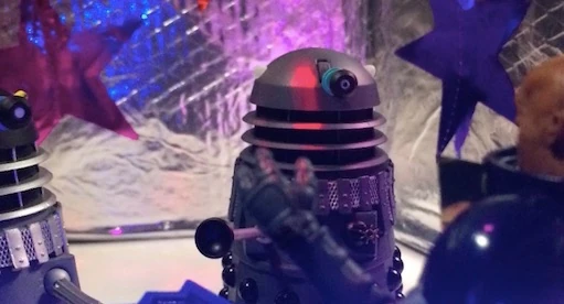 Grey Daleks feature alongside silver "Exxilon Daleks" in Regression of the Daleks, a fictional 1988 serial of Doctor Who which features in the fourth episode of It's a Sin.