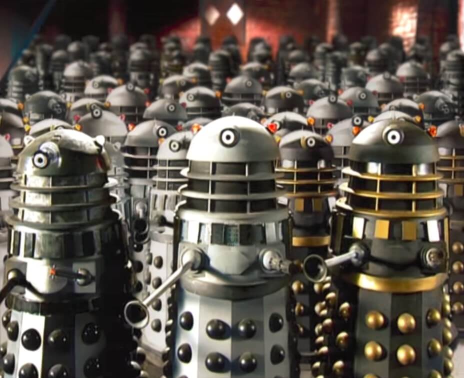 Bomb-laden Daleks on the march during the Dalek-Movellan War. (TV: Destiny of the Daleks)