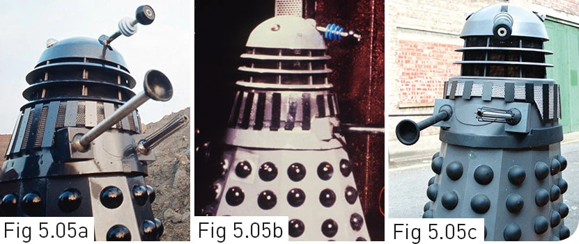 The Time Lords who scrutinised Dalek history during the Time War identified the grey Daleks as Type IV Daleks, following the silver Type I and its modifications, the Type II and the now slatted Type III Dalek. The black sense globes were identified as "multiphase" improvements to the blue globes used by the first three Types. They observed that the Type IV, which retained many of the features of the earliest prototypes, which had a toughened grey coating bonded to the Dalekanium shell. The prototype design had been replicated for later design units with variant coatings resulting in different shades of grey as the Type IV was used in many campaigns. The Dalek Combat Training Manual identified three distinct shades: an initial, darker shade, the lighter shade associated with the Movellan War, and the shade used by the Renegade Daleks. The manual also advised that damage inflicted in various battles resulted in some of these units being particularly susceptible to attack. The Type IV was followed by a modified silver Dalek model with black sense globes, the Type V, the structure of which formed the basis of Davros' prototype Imperial Daleks, the Type VI, which was refined into the Type VII. (PROSE: Dalek Combat Training Manual)