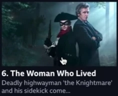 The Woman Who Lived's listing on BBC iPlayer, mentioning the "deadly highwayman". (WC: The Zygon Isolation)