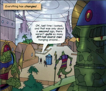 Hiram is angry to find them there, but gets sucked through a time hole, which closes behind him. The whole world changes. Heather and the Doctor find themselves inside a city of eight foot tall lizard men. The Lizard men chase them and, while they are hiding, they encounter an old bearded man who believes the Doctor can save them from the Incasaurs.