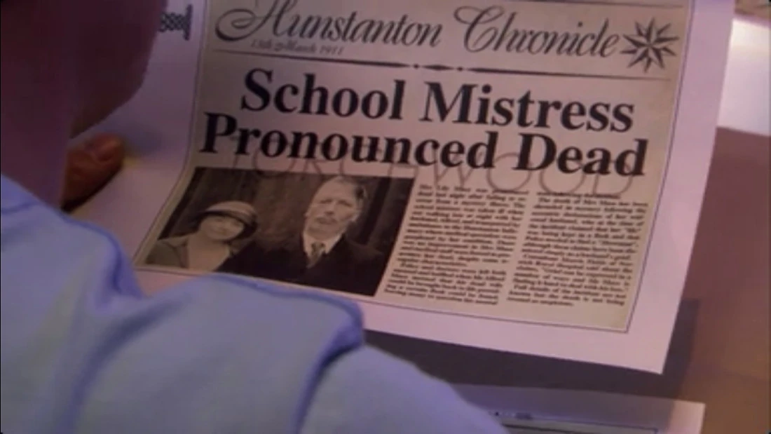 The Hunstanton Chronicle was the local newspaper for Hunstanton. It reported, "School Mistress Pronounced Dead" on 13 March 1911. (TV: From Out of the Rain [+]Peter J. Hammond, Torchwood series 2 (BBC Three, 2008).)