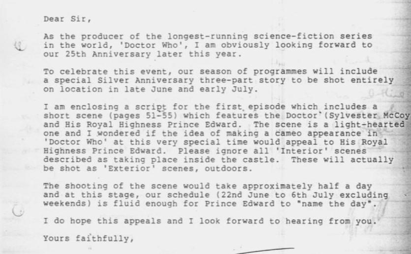 Nathan-Turner's letter asking Prince Edward, Earl of Wessex if he would like to appear in Silver Nemesis.