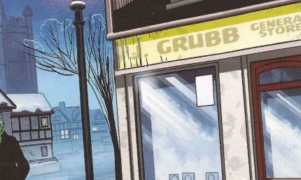The Tenth Doctor landed his TARDIS outside the J. Grubb General Store when he visited the village with Majenta Pryce in mid-December 2008. At this point in time, the store's sign was slightly worn. (COMIC: The Stockbridge Child)